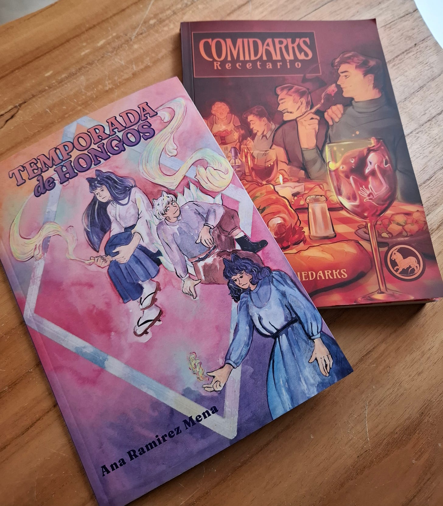 Hace unas semanas fue la Crack Bang Boom, y con eso, la publicación de mi primer libro como autora integral y una participación en una antología. Y si bien ya tengo dos libros con Pulp Stories en los que participé tanto en el guión como en el dibujo (fueron trabajos en equipo), Temporada de hongos es especial. Empezó como un proyecto de un taller de guión allá por el 2021; durante el 22 empecé a hacerlo y lo abandoné. Recién en el 2023 me dediqué de lleno a hacer el proyecto con la seriedad que merecía. Me llevó un año y medio hacerlo, lo terminé para la CBB del 24 en formato de tres fanzines, y recién este año le di forma de libro. Y si les interesa ver un poco más, acá les dejo un video de YT donde muestro un poco del proceso (¡qué vergüenza me da esto, jajaja!). También participé en la antología Comidark de los Sociedarks; el libro quedó espectacular, tiene un montón de detalles hermosos, las páginas guardas me enloquecieron. Estoy muy contenta de haber participado.