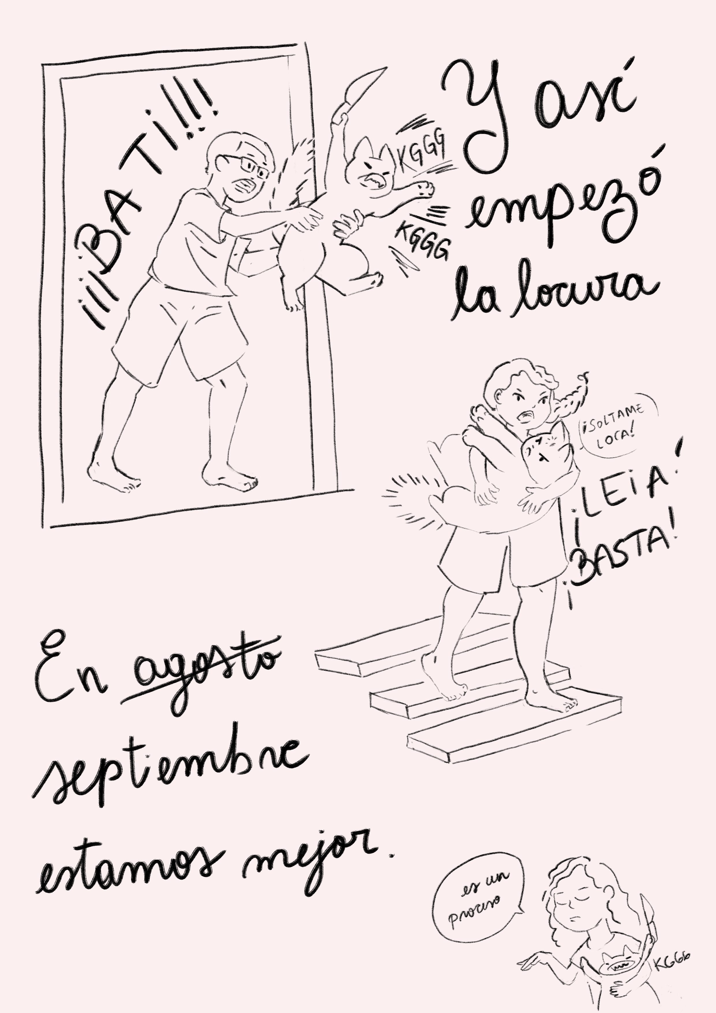 Hay que aclarar que una de las mayores particularidades de nuestra vida es que los gatos se odian. Desde febrero de este año no se pueden ver, y llegamos a una paz dividiendo el departamento en dos áreas, una para cada gato. Consultamos con diferentes profesionales y son dos gatos muy territoriales que no están dispuestos a compartir espacios.